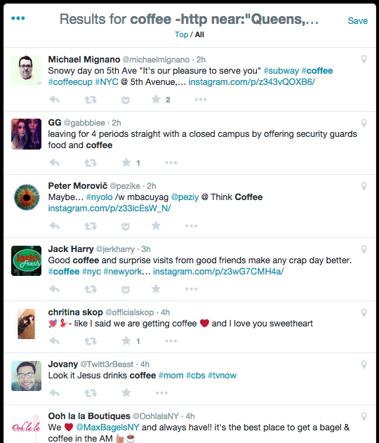 Think about this carefully. Let’s say you own a coffee business in Queens, New York. You’re not a massively big franchise and you depend on your local customers for your daily revenue. With Twitter’s advance search you can easily reach out to those local people talking about coffee in Queens, New York.
