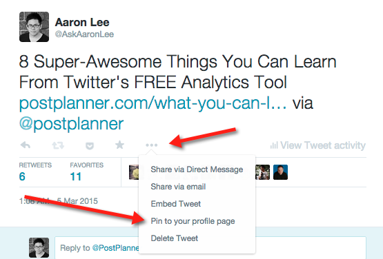 If you’ve not pinned your tweets before, you’re missing out. You will actually get extra exposure for a specific tweet that you want more clicks, retweets, favorite and comments.